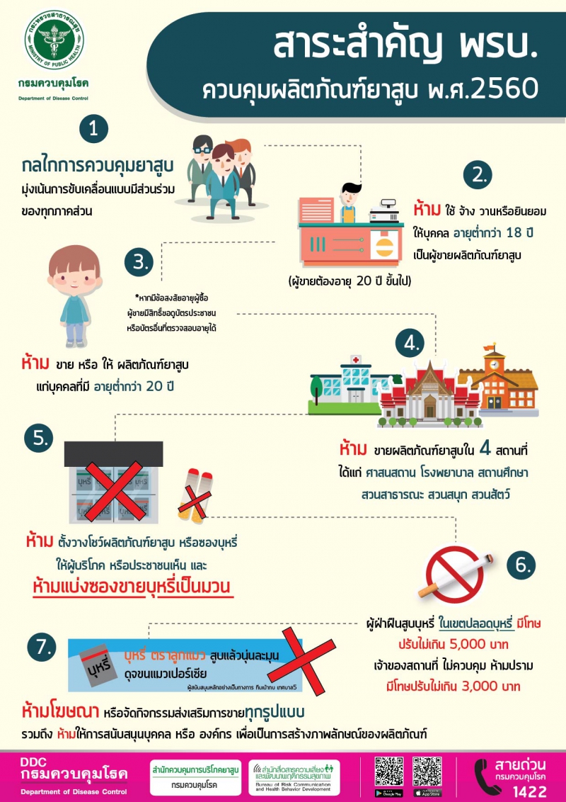 รายละเอียด : ตามพระราชบัญญัติควบคุมยาสูบ พ.ศ. 2564 หมวด 4 การควบคุมผลิตภัณฑ์ยาสูบ หมวด 5 การคุ้มครองสุขภาพของผู้ไม่สูบบุหรี่