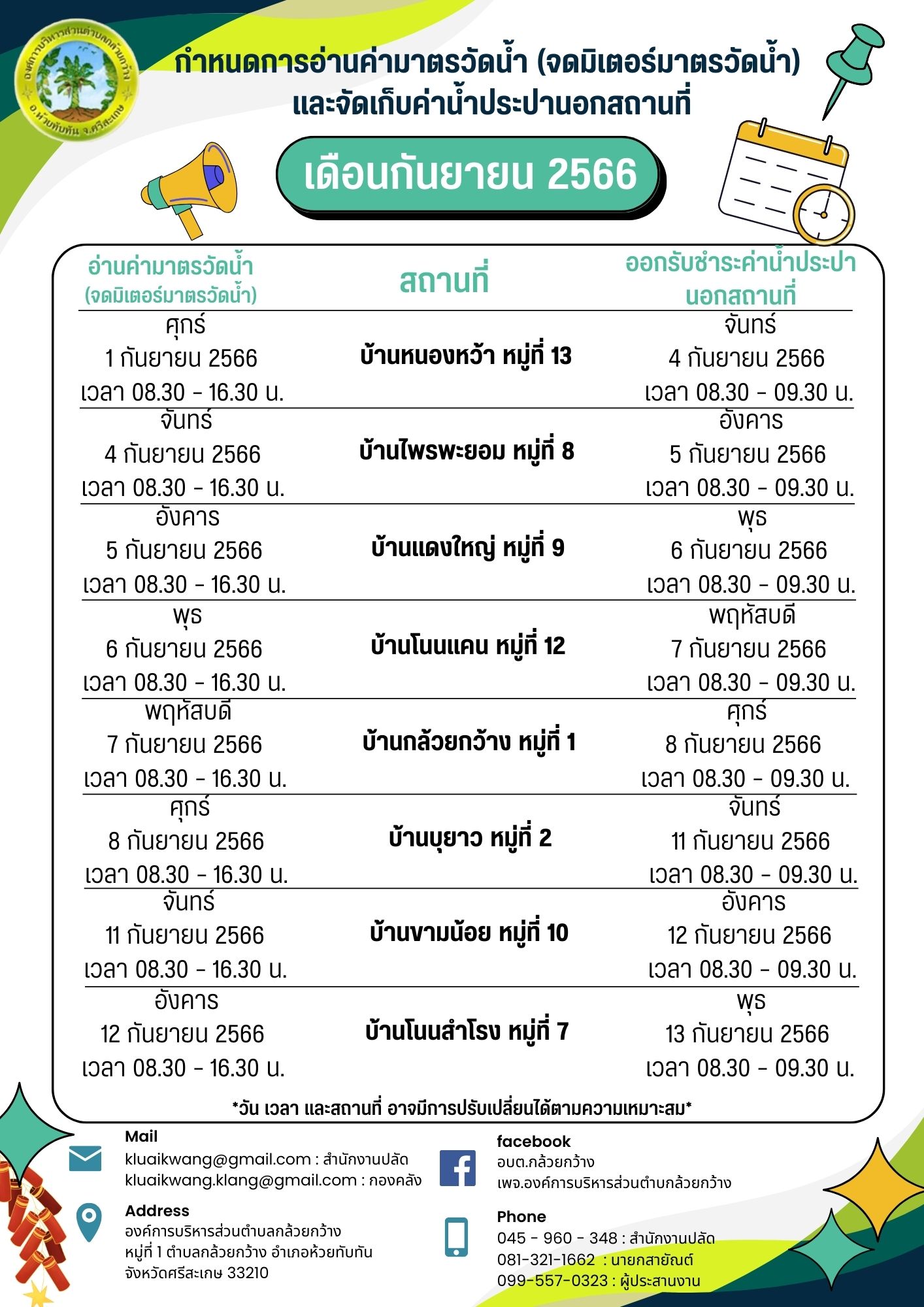 ชื่อเรื่อง : ขอแจ้งประชาสัมพันธ์กำหนดการ #จดมิเตอร์มาตรวัดน้ำ และ #กำหนดการออกจัดเก็บค่าน้ำประปานอกสถานที่ เพื่อบริการพี่น้องประชาชน #ประจำเดือนกันยายน 2566