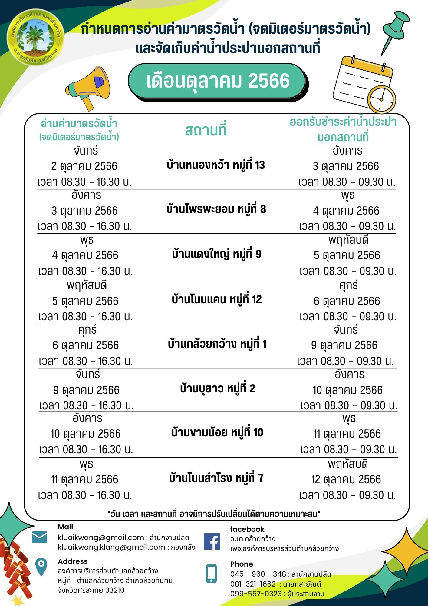 รายละเอียด : งานจัดเก็บรายได้ กองคลัง ขอแจ้งประชาสัมพันธ์กำหนดการ #จดมิเตอร์มาตรวัดน้ำ และกำหนดการออกจัดเก็บค่าน้ำประปานอกสถานที่ เพื่อบริการพี่น้องประชาชน ประจำเดือนตุลาคม 2566 สอบถามค่าน้ำประปาหรือบริการช่องชำระออนไลน์ 1.งานจัดเก็บรายได้ กองคลัง 2.ผ่าน Line Official Account ID : @692tiowi 3.ผ่าน Facebook : อบต.กล้วยกว้าง 4.โทร 045 960 348 หรือ 0995570323
