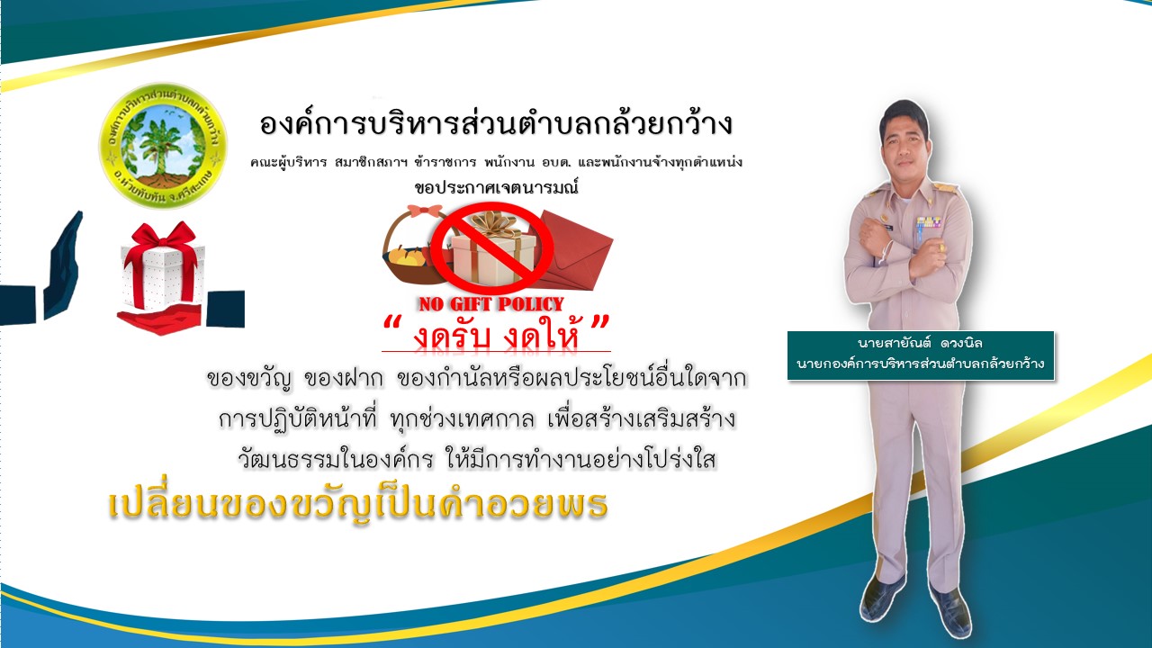ประกาศองค์การบริหารส่วนตำบลกล้วยกว้าง เรื่อง นโยบายไม่รับของขวัญหรือของกำนัลจากการปฏิบัติหน้าที่ (No Gift Policy) ประจำปีงบประมาณ 2568