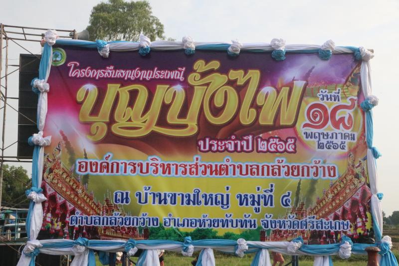 รายละเอียด : โครงการสืบสานงานประเพณีบุญบั้งไฟ ประจำปีงบประมาณ 2565 เพื่อการอนุรักษ์ สืบสาน ประเพณีวัฒนธรรมท้องถิ่นให้คงอยู่ในตำบลกล้วยกว้าง ซึ่งกำหนดจัดงานขึ้นในวันพุธ ที่ 18 พฤษภาคม 2565 ณ บ้านขามใหญ่ ตำบลกล้วยกว้าง อำเภอห้วยทับทัน จังหวัดศรีสะเกษ เวลา 07.00 น. - 17.00 น.