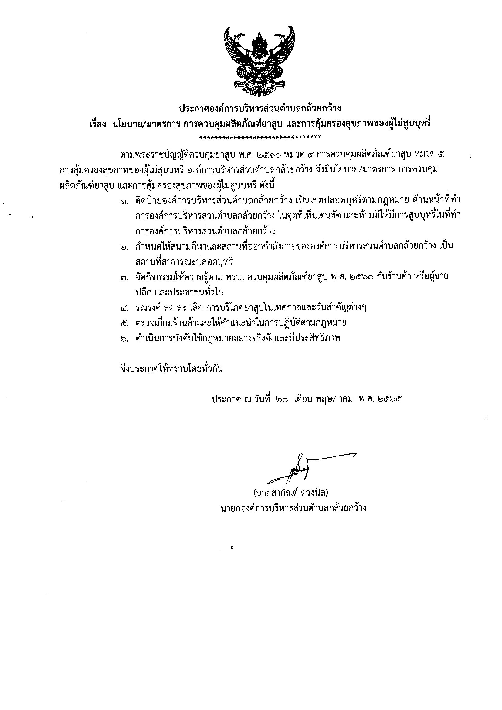 ชื่อเรื่อง : ประกาศองค์การบริหารส่วนตำบลกล้วยกว้าง เรื่องนโยบาย/มาตรการ การควบคุมผลิตภัณฑ์ยาสูบ และการคุ้มครองสุขภาพของผู้ไม่สูบบุหรี่