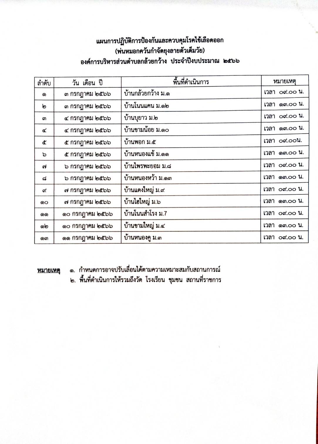 แผนการปฏิบัติการป้องกันและควบคุมโรคไข้เลือดออก (พ่นหมอกควันกำจัดยุงลายตัวเต็มวัย) ประจำปีงบประมาณ 2566