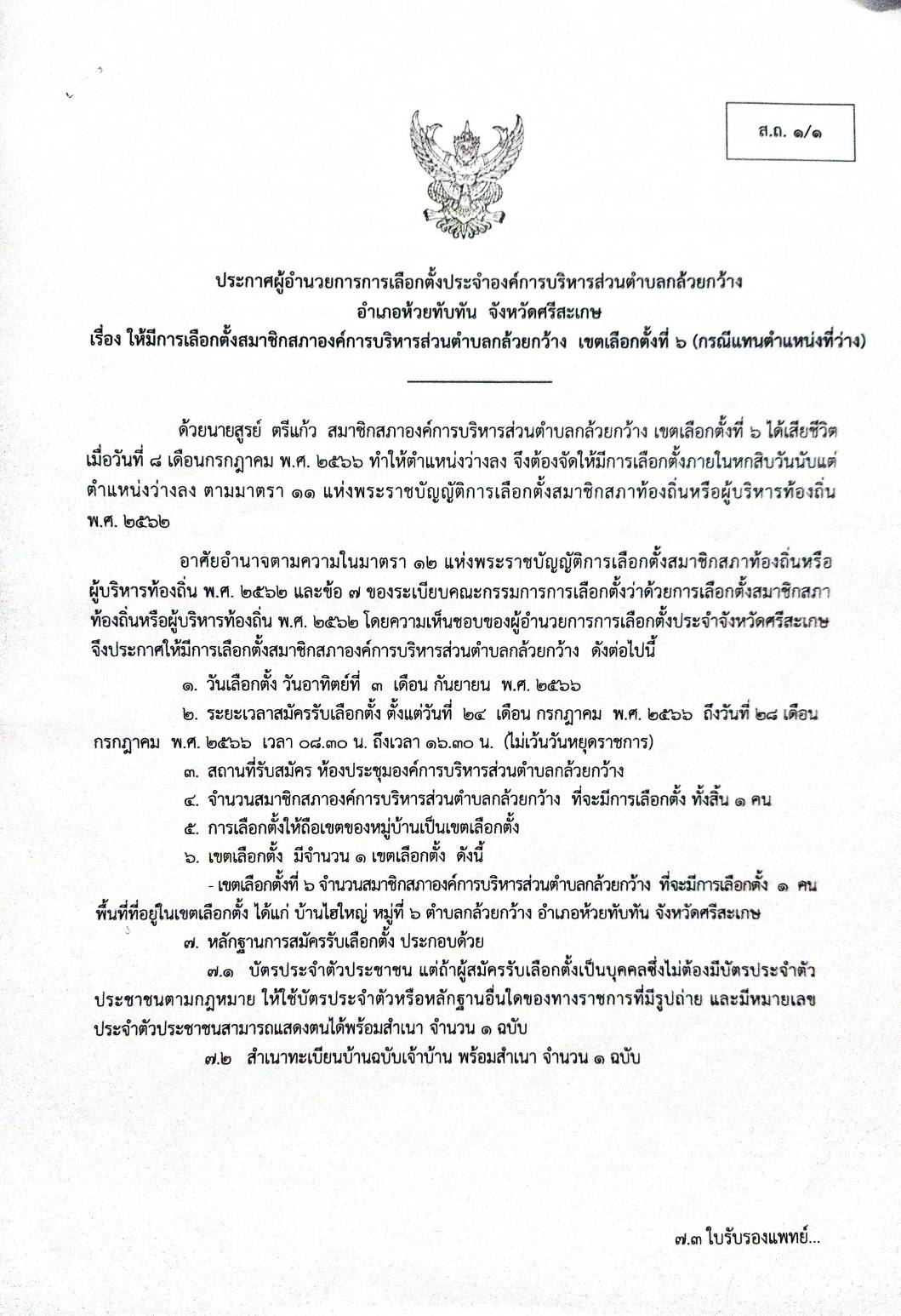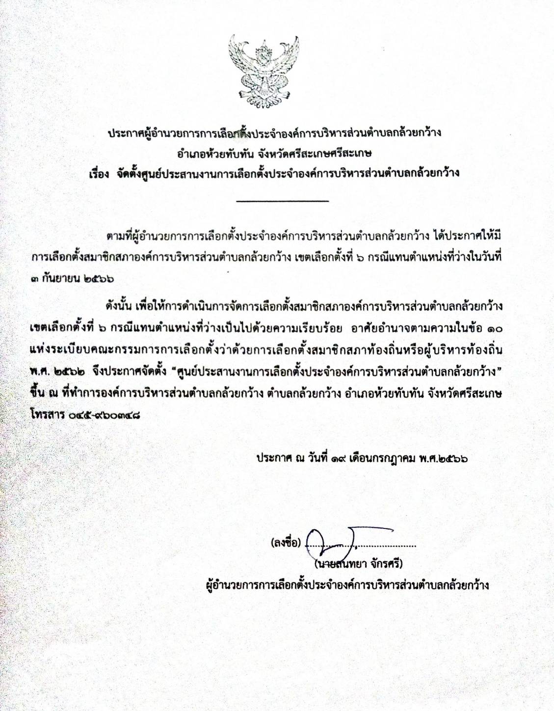 ✍️ผู้อำนวยการการเลือกตั้งประจำองค์การบริหารส่วนตำบลกล้วยกว้าง จึงขอประกาศให้มีการเลือกต้ังสมาชิกสภาองค์การบริหารส่วนตำบลกล้วยกว้าง เขตเลือกตั้งที่ 6 (กรณีแทนตำแหน่งที่ว่าง) โดยความเห็นของผู้อำนวยการเลือกตั้งประจำจังหวัดศรีสะเกษขึ้น โดยกำหนดการระยะเวลารับสมัคร ตั้งแต่วันที่ 24 กรกฎาคม 2566 ถึงวันที่ 28 กรกฎาคม 2566