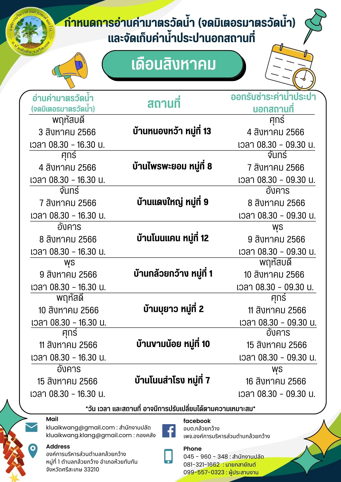 ตารางอ่านค่ามาตรวัดน้ำ (จดมิเตอรมาตรวัดน้ำ) และจัดเก็บค่าน้ำประปานอกสถานที่ ประจำเดือน สิงหาคม 2566