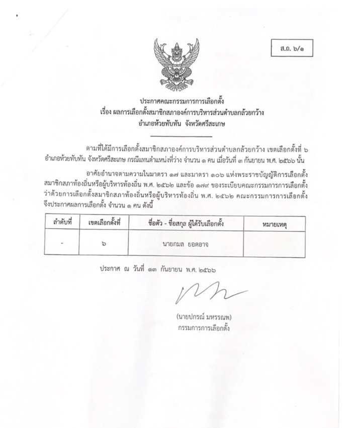 ประกาศผลการเลือกต้ัง สมาชิกสภาองค์การบริหารส่วนตำบลกล้วยกว้าง เขตที่ 6 กรณีแทนตำแหน่งที่ว่าง อย่างเป็นทางการ