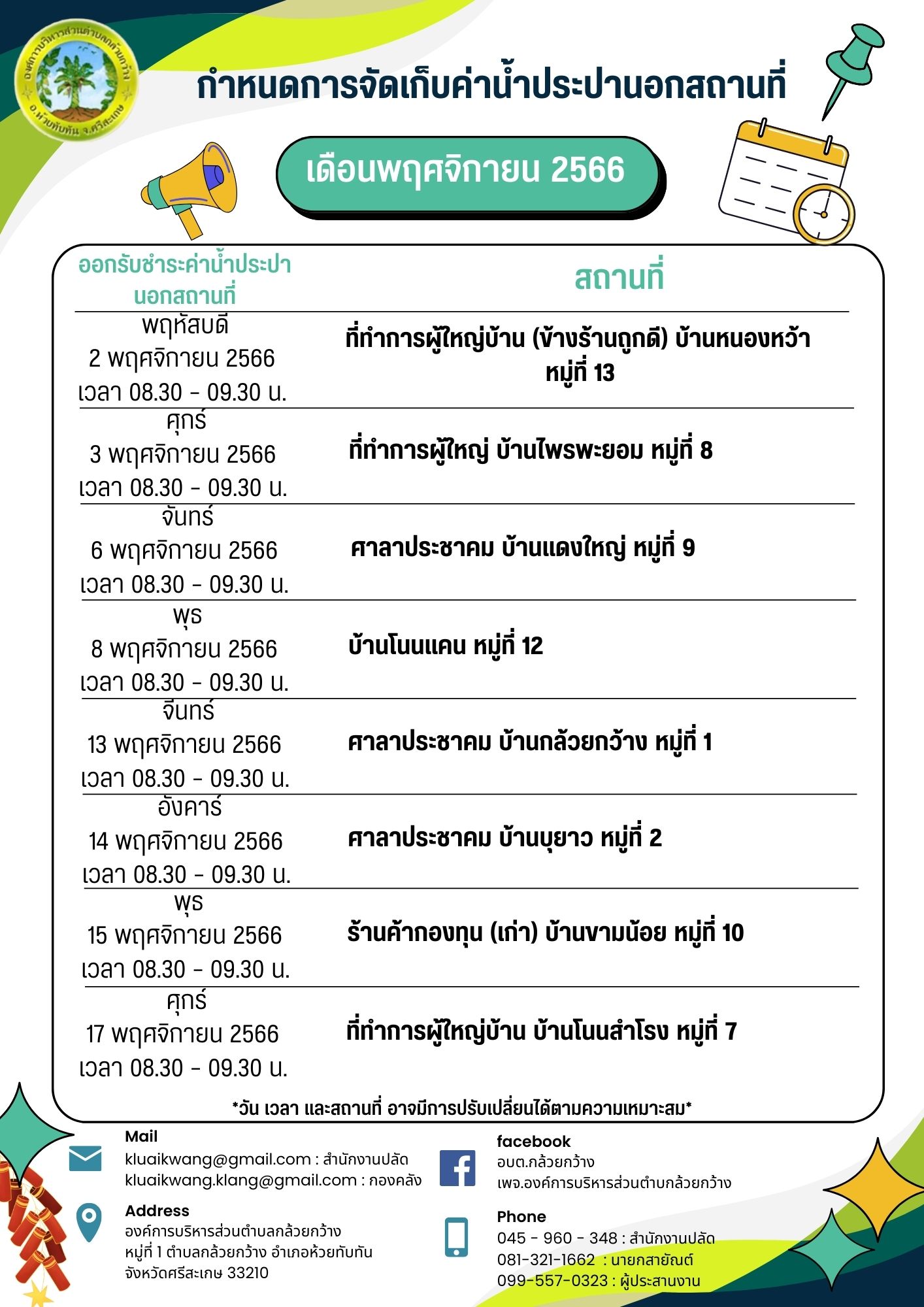 ชื่อเรื่อง : ประชาสัมพันธ์กำหนดการออกจัดเก็บค่าน้ำประปานอกสถานที่ เพื่อบริการประชาชน ประจำเดือนพฤศจิกายน 2566