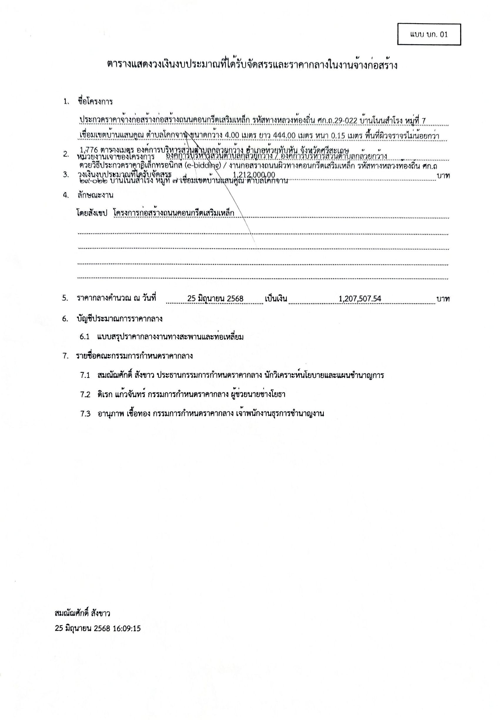 ตารางแสดงวงเงินงบประมาณที่ได้รับสรรและราคากลางในงานจ้างก่อสร้าง ประกวดราคาจ้างก่อสร้างถนนคอนกรีตเสริมเหล็ก รหัสทางหลวงท้องถิ่น ศก.ถ.29-022 บ้านโนนสำโร